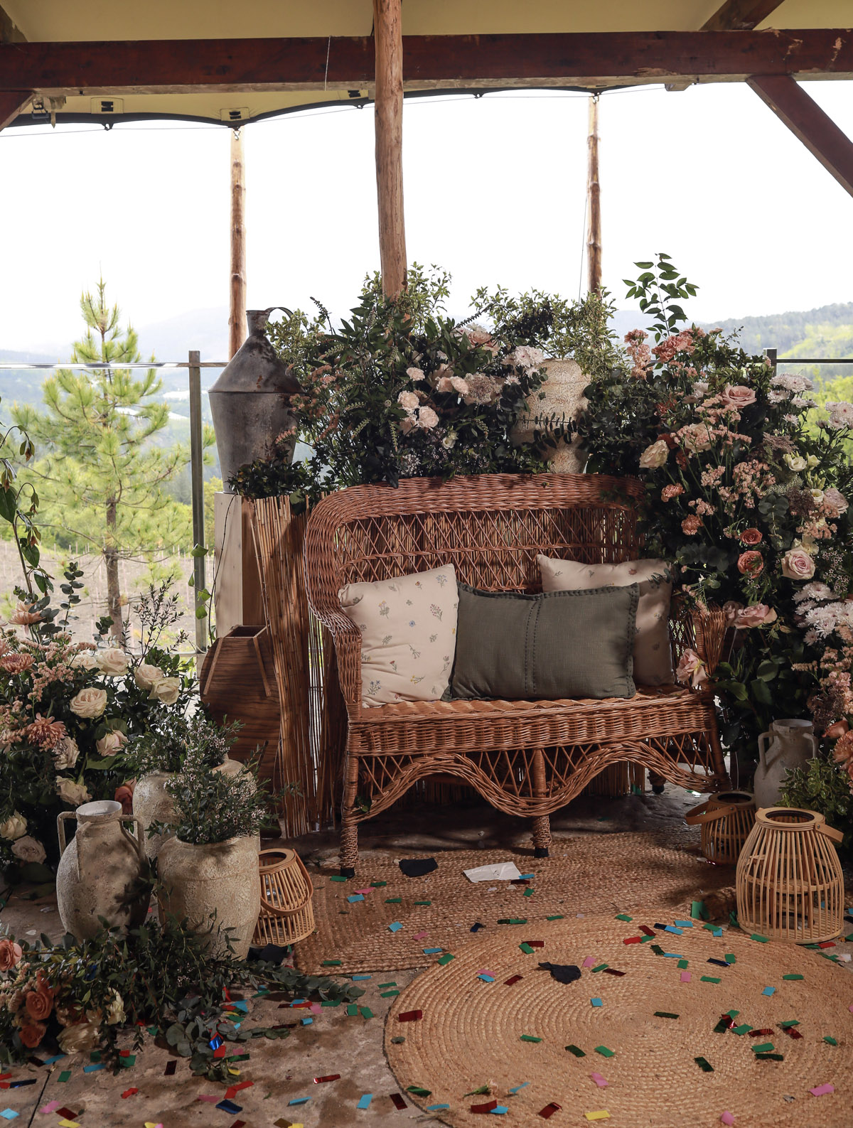 La ambientación floral, obra de Udane Irastorza, llenó el espacio de color y delicadeza. Tonos rosas suaves y vibrantes se mezclaron con verdes naturales, generando un entorno romántico y fresco que encajaba perfectamente con la estética de la boda y el espíritu de la pareja.