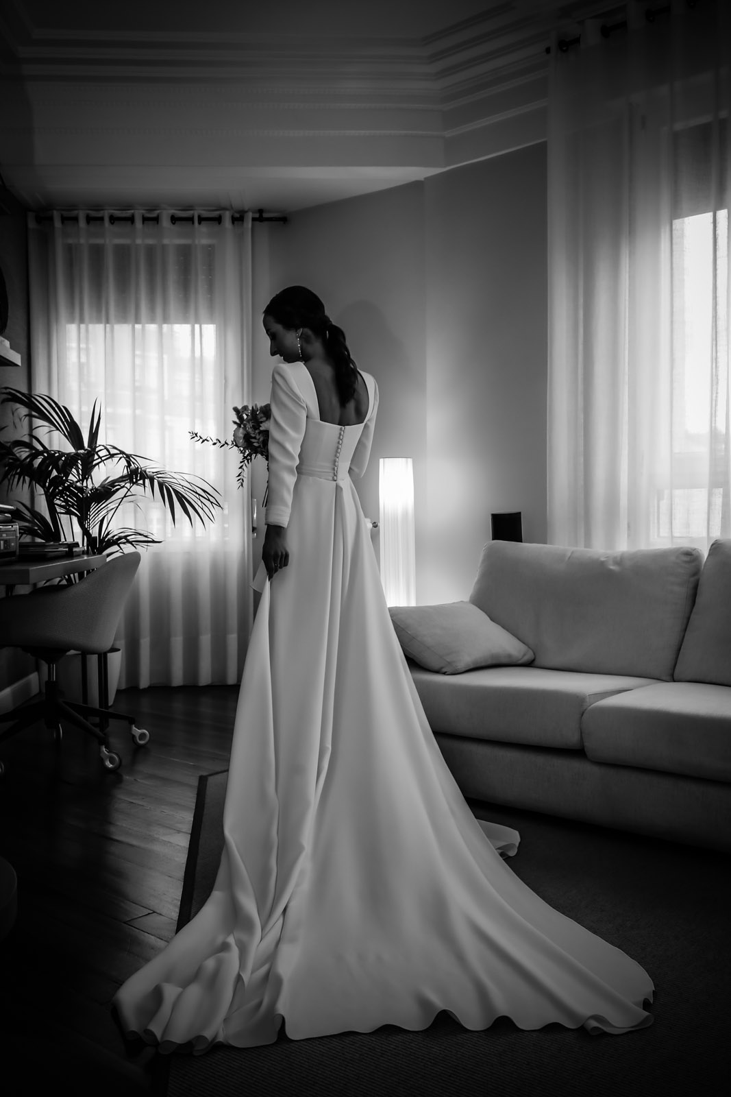 La novia sorprendió con un diseño exclusivo de Paz Quintana, pensado para evolucionar con el día. El vestido incorporaba mangas y cola desmontables, permitiéndole pasar del estilo clásico de la ceremonia a un palabra de honor más recogido para la fiesta. Una apuesta por la versatilidad, sin perder elegancia, que encantó a todos los invitados.