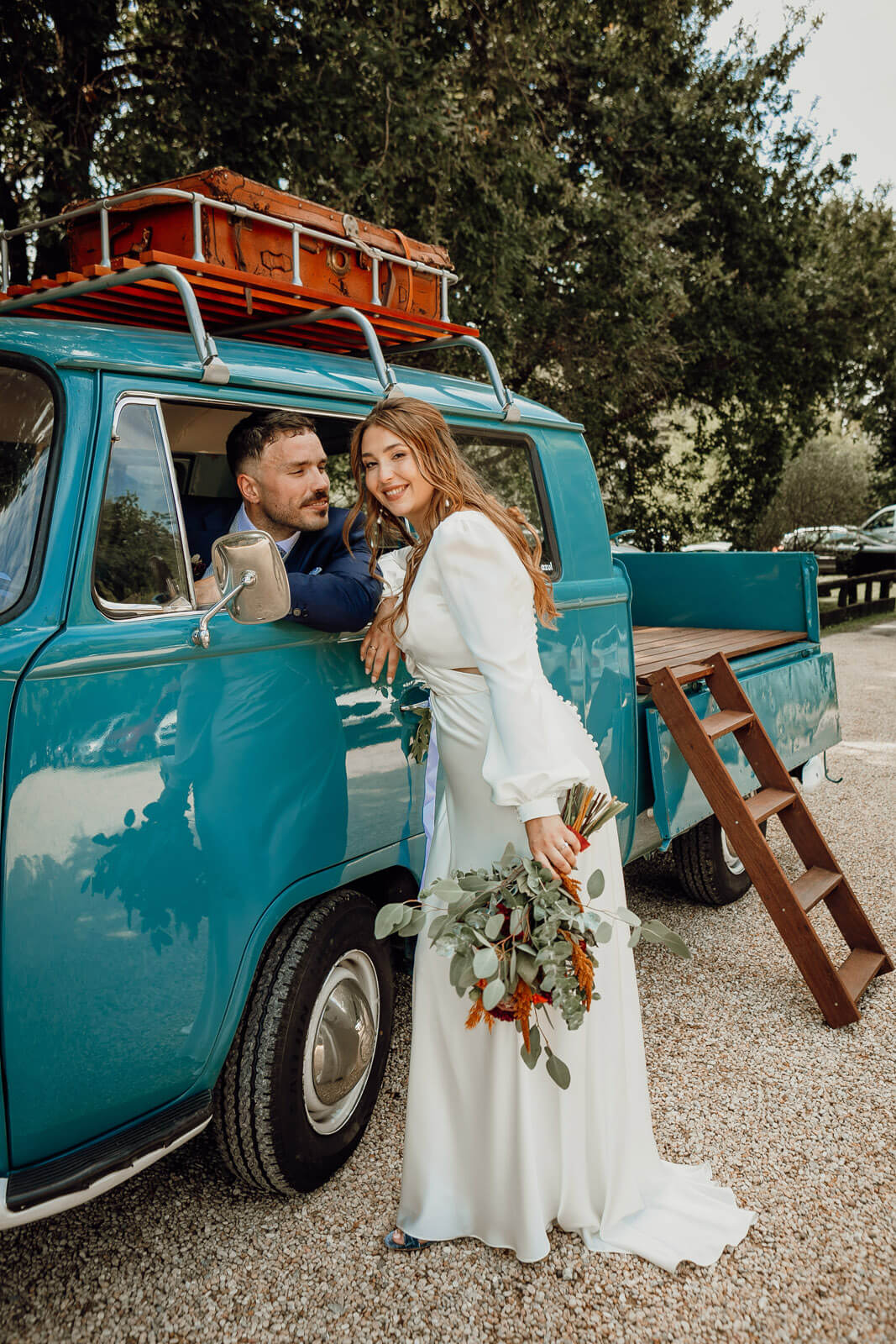 Olvidemos los clichés: esta novia llegó a la ceremonia en una encantadora furgoneta azul que, lejos de romper la estética, sumó carácter y autenticidad a una boda ya de por sí diferente. Un detalle que nadie olvidará.